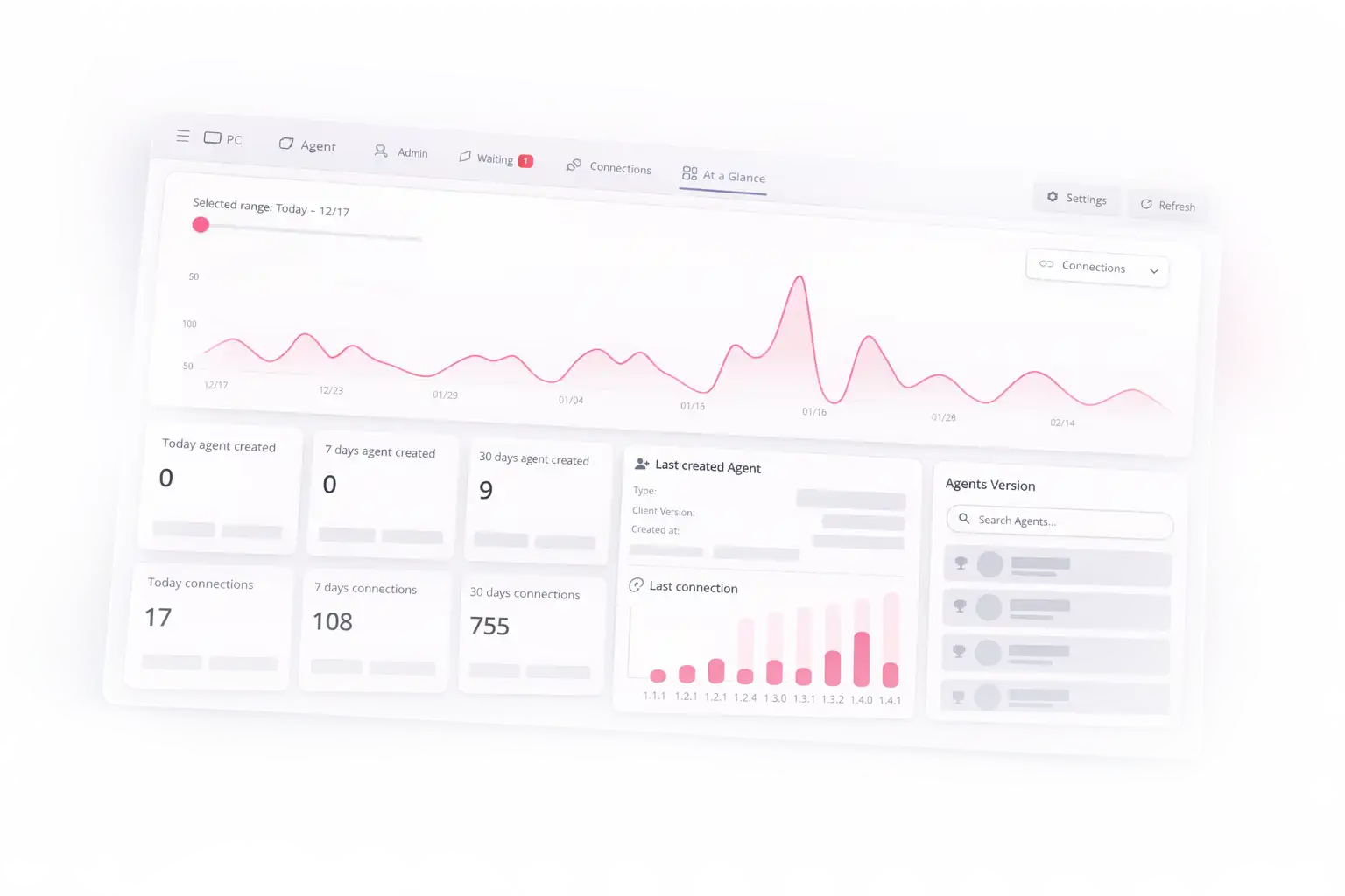 ادمین کاربران جدید را در Waiting تأیید میکند، دسترسیها را در بخش PC/Agent مشخص میکند و در صورت نیاز میتواند بدون تأیید کاربر به سیستمها متصل شود. همچنین گزارش اتصالهای آنلاین و گذشته، جزئیات هر نشست و آمار کلی استفاده در پنل قابل مشاهده است.
